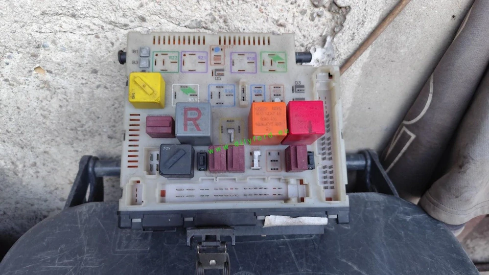 Pojistková skříňka pro vozy Ford Escort MkVII (1995-2000), ověřte číselný kód natištěný v polovině levé strany bílého plastu, jiný kód má jiné zapojení. Použité zboží.