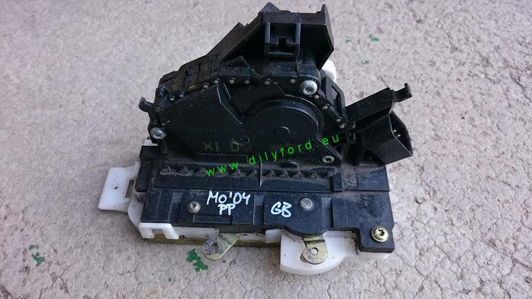 Mechanismus zámku pravých předních dveří s motorkem centrálu z vozu Mondeo III (2004 GB) - anglická verze - má navíc 1 táhlo od vložky na klíč, což evropská verze nemá